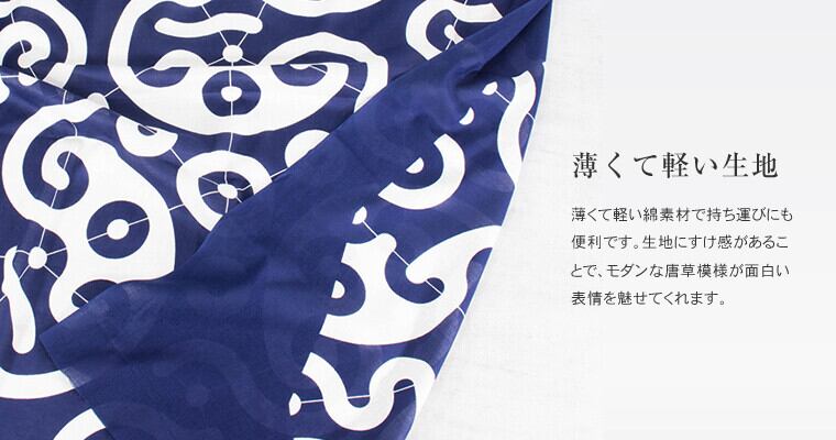PPP紋様(Piecing Pieces Pattern)は,ピース同士を隣り合わせると,どの方向にも唐草紋様が繋がります。同じピースの組み合わせを変えることで,様々なデザインを生み出すことが可能です。シンプルなカラーリングは男性にも使いやすく,薄く軽い生地は持ち運びにも便利です。大きな風呂敷はストールなど,小さな風呂敷はハンカチなどとしてもご利用頂けます。